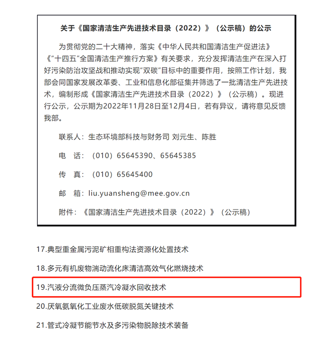 喜報(bào)| 我司汽液分流微負(fù)壓蒸汽冷凝水回收技術(shù)成功入選《國家清潔生產(chǎn)先進(jìn)技術(shù)目錄(2022)》