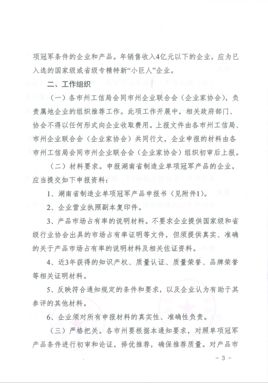 關(guān)于組織推薦第四批湖南省制造業(yè)單項冠軍產(chǎn)品的通知