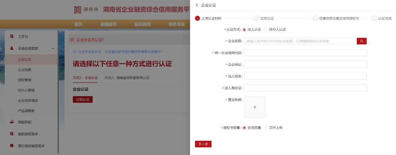 4、在企業(yè)實(shí)名認(rèn)證頁面,選擇認(rèn)證方式(企業(yè)認(rèn)證:需上傳營業(yè)執(zhí)照信息,湖南省政務(wù)服務(wù)網(wǎng)認(rèn)證:需在湖南省政務(wù)服務(wù)網(wǎng)開通了賬號(hào)),并按照認(rèn)證流程進(jìn)行操作。